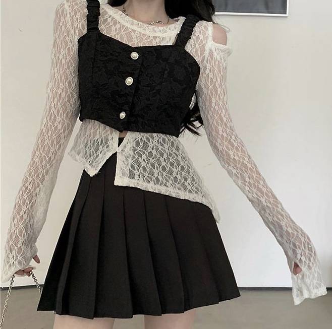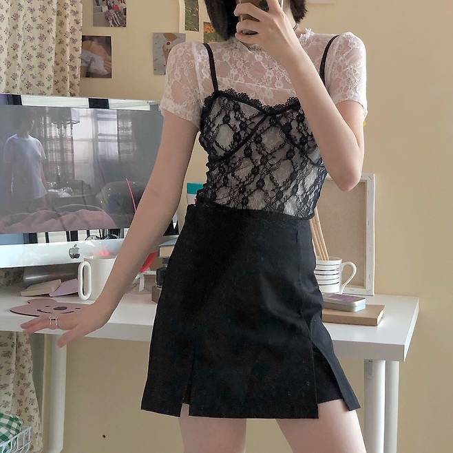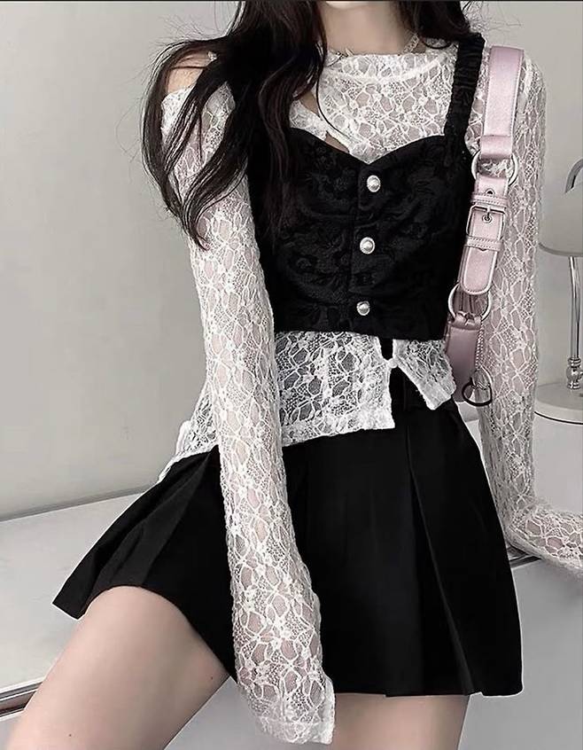 레이스 톱을 이너로 넣을 경우, 상의의 기장은 짧게, 하의는 미디~미니 길이로 맞춰