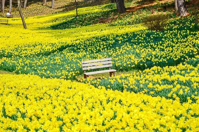 전남 구례에 위치한 이곳은 섬진강과 지리산을 배경으로 노란 수선화가 부드럽게 언덕을 감싼다. 이국적인 이름과 달리, 전통과 자연이 공존하는 공간이다. 4월 초 기준 수선화는 절반 이상 피었으며, 이후 며칠 사이 꽃밭 전체가 만개했다. 오전 시간 방문 시 비교적 한적해, 풍경 감상에 좋다.