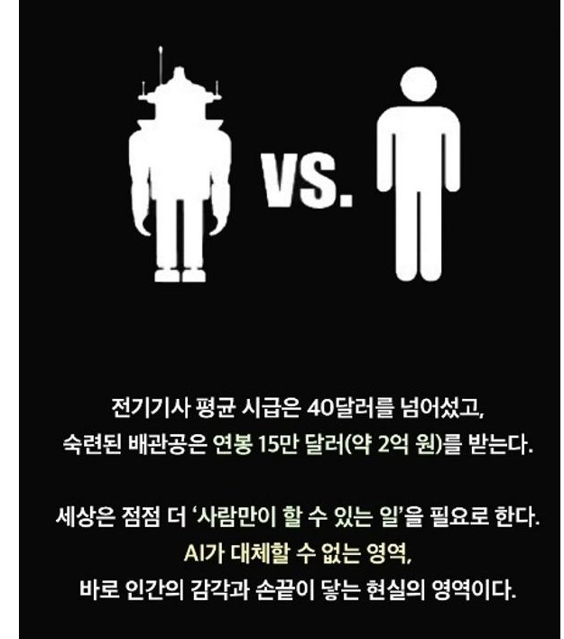 AI 전문가, 데이터 분석가, 로봇 기술자, 시스템 운영관리자는 오히려 AI 시대에 가장 필요한 분야입니다. 새로운 기술이 등장할수록 그 기술을 다루는 사람도 반드시 필요해집니다.