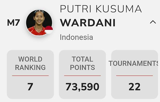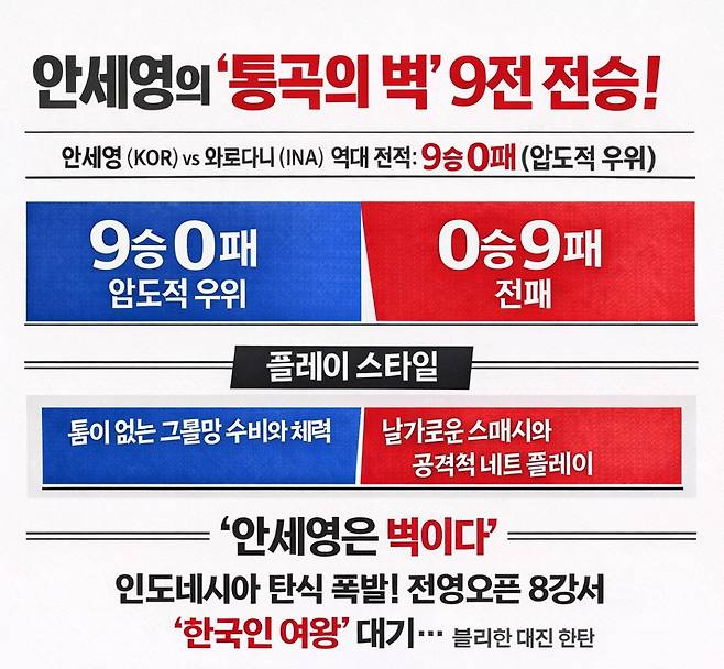 8강 상대는 인도네시아의 국민적 아이콘이자 현직 경찰(경장)인 푸트리 쿠수마 와르다니(세계 6위)다. 와르다니는 경찰 특유의 집요한 추격전과 날카로운 스매시를 주무기로 삼지만, 안세영이라는 거대한 벽 앞에서는 늘 고개를 숙였다. 안세영은 와르다니를 상대로 통산 9전 전승을 기록 중이며, 상대의 파상공세를 무력화하는 전술적 우위를 점하고 있다.