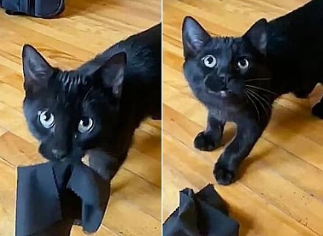 이후 고양이는 매일 같이 입에 무언가를 물고서 자원 봉사자들에게 내밀어 보인다고 하는데요. 그건 바로 천 조각이나 장난감들이었죠.
