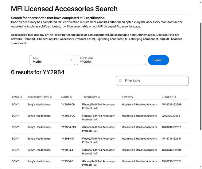 그럼에도 불구하고, 'The Walkman Blog'에 따르면 WH-1000XM6의 존재를 강하게 뒷받침하는 중요한 단서가 발견됐습니다. 바로 애플의 MFi(Made for iPhone/iPod/iPad) 인증을 소니가 받았다는 사실인데요. 모델 번호는 YY2984로, 이 번호가 이전부터 WH-1000XM6와 연결되어 있다는 이야기가 돌았어요.