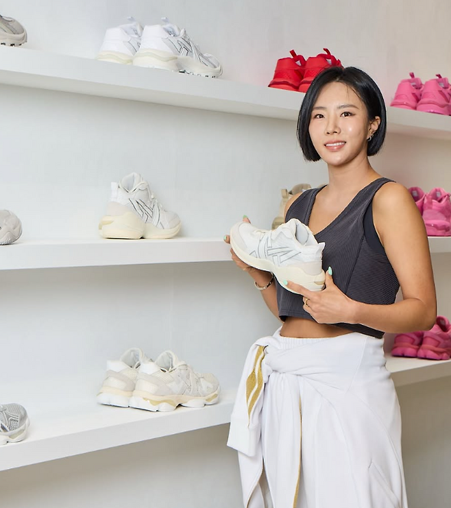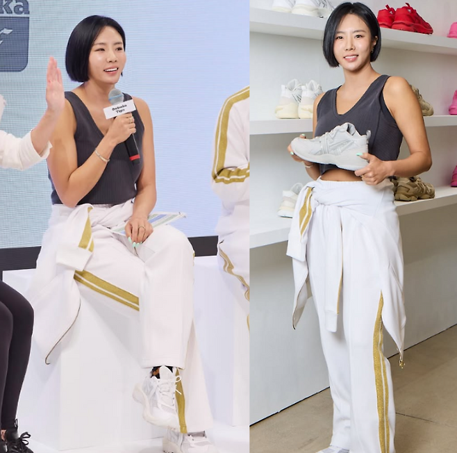 이상화 님이 착용한 상의는 크롭 한 기장의 그레이 컬러 나시티였어요. 운동선수 출신다운 탄탄한 어깨 라인과 복근이 자연스럽게 드러나는 디자인으로, 건강미를 물씬 풍겼죠.