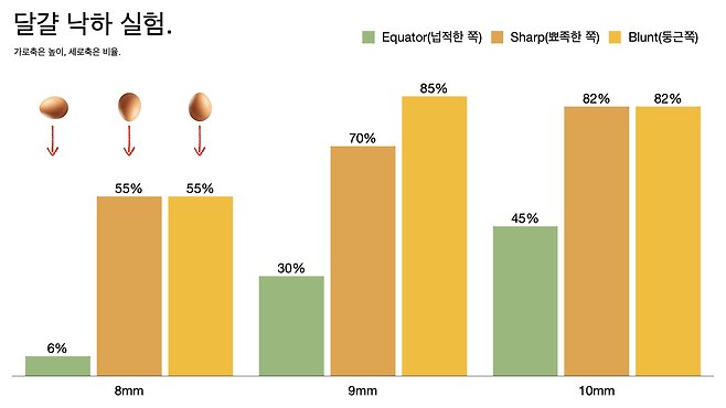 - 달걀 낙하 실험 관련해서 데이터를 좀 살펴봤습니다. 180개 달걀을 세 방향으로 나눠서 60개씩 떨어뜨렸고 아래 그림에서 보는 것처럼 확실히 넓은 쪽, 수평 방향으로 떨어뜨릴 때 덜 깨졌습니다.