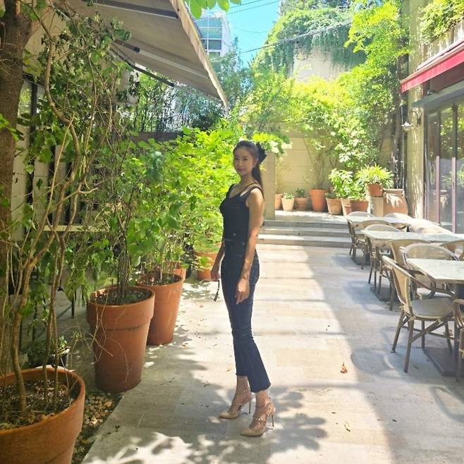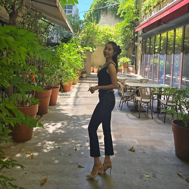 한다감은 검정 민소매 톱과 하이웨이스트 데님 팬츠를 매치해 담백하면서도 단단한 무드를 연출했어요.