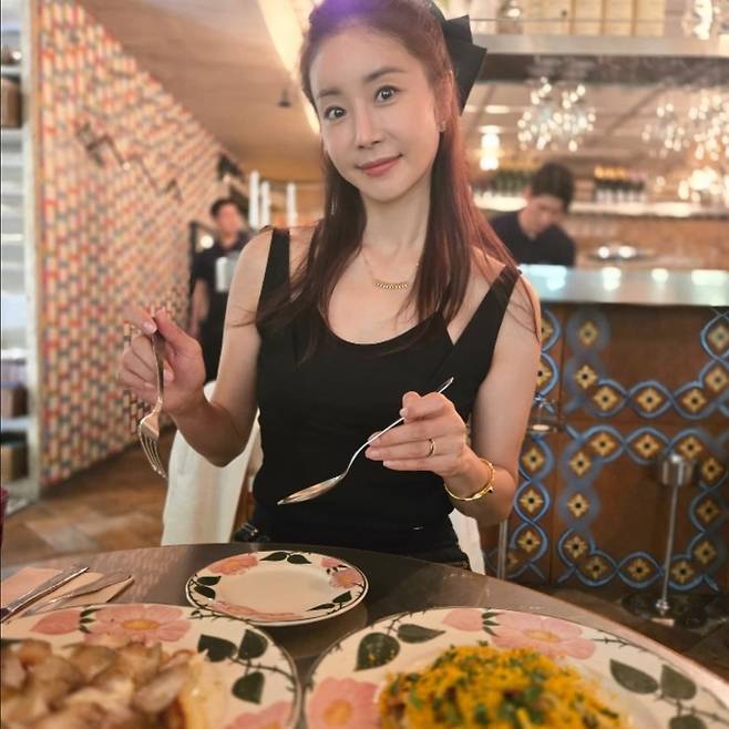 식당에서의 다른 컷에서는 같은 톱을 입고 있지만 조명과 표정만으로도 또 다른 분위기를 만들어냅니다.