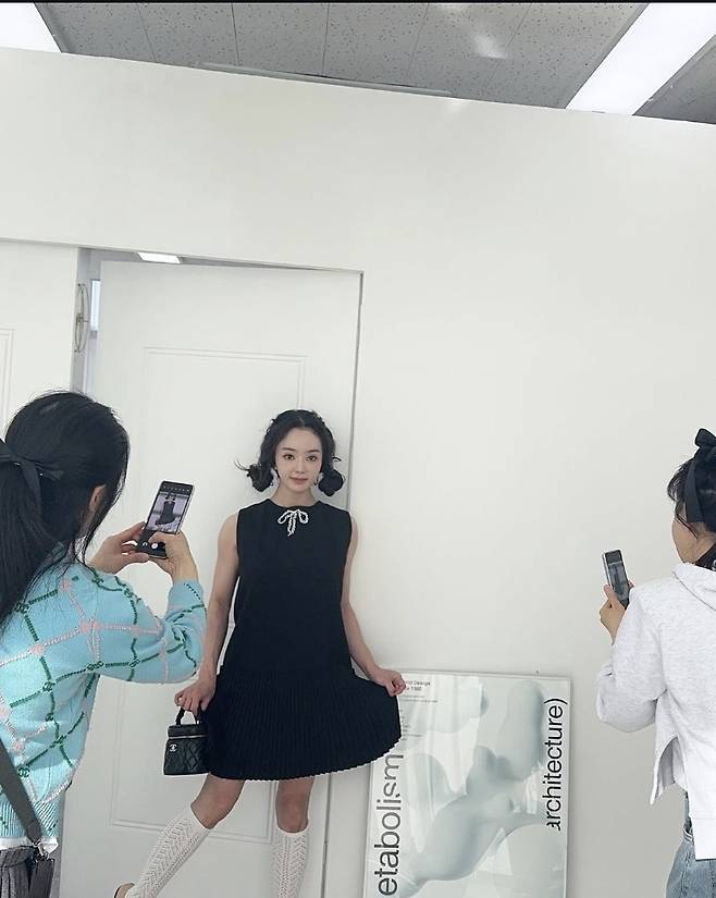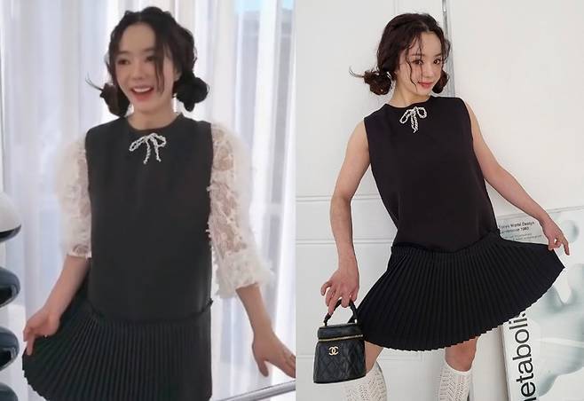 특히 한쪽에서는 레이스 소매로 여성스러움을 강조한 반면, 민소매 버전에서는 롱 니삭스와 샤넬 백을 매치해 키치하면서도 고급스러운 분위기를 동시에 연출했습니다.