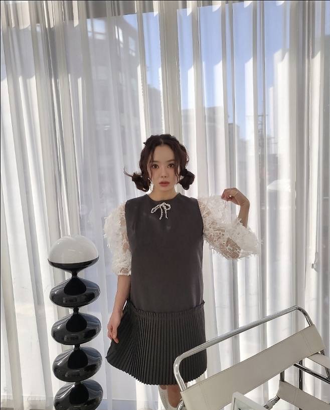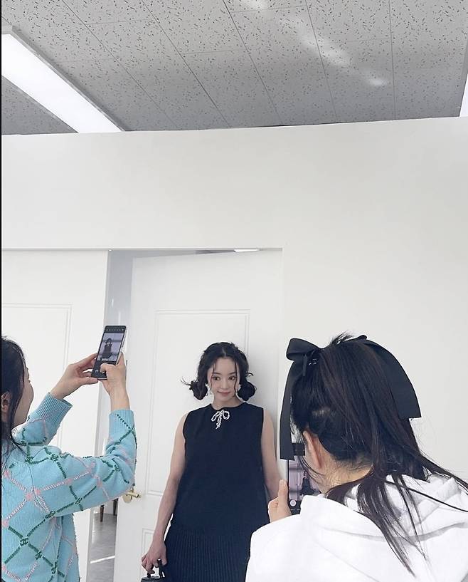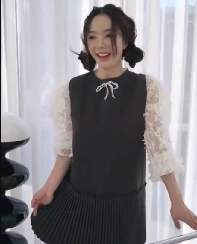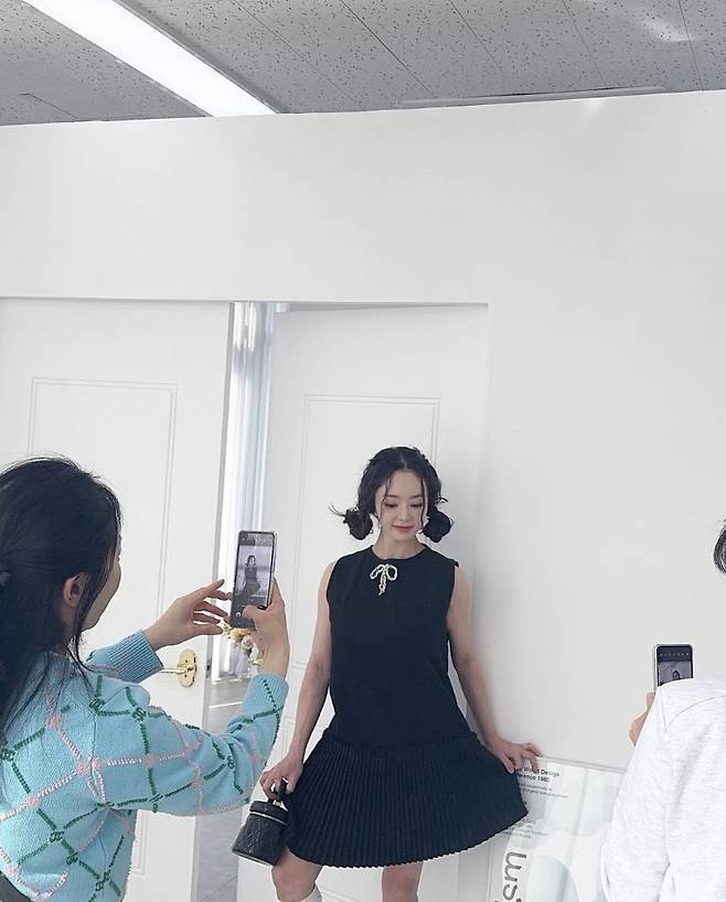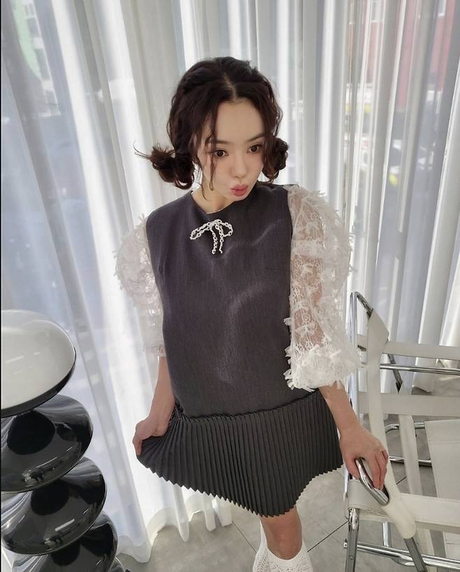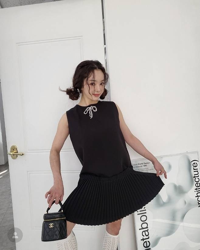 서우는 블랙 플리츠 원피스에 리본 디테일로 포인트를 더하고 깜찍한 양갈래 헤어스타일로 동안미를 극대화했습니다.