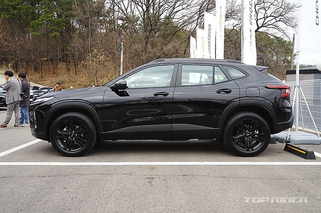 측면부에서는 날렵하면서 스포티한 프로포션이 특징이다. 전장 4540mm, 전폭 1825mm, 전고 1560mm, 휠베이스 2700mm의 차체는 신형 코나와 비교시 전장 +190, 전고 -25, 휠베이스 +40mm로 트랙스가 길고 낮은 형상이다. CUV와 SUV로 다르나 공교롭게 비교가 된다.