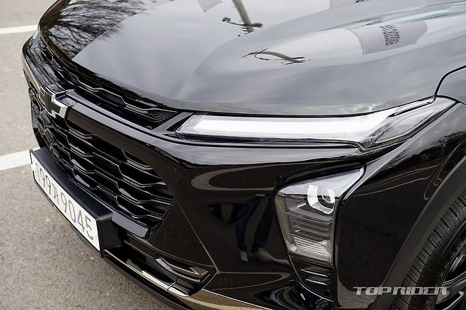 트랙스의 전면부는 쉐보레 SUV 디자인의 전환점이 된 쉐보레 블레이저의 분위기를 닮았다. 엔트리 모델부터 LED 주간주행등과 LED 프로젝션 헤드램프, LED 리어램프를 적용한 점은 놀라운 부분이다. 그릴과 사이드미러는 유광 블랙으로, 블랙 외장에서는 구분되지 않는다.