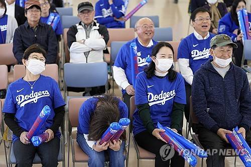 People react as they watch a live view of Game 4 of the baseball World Series between the Los Angeles Dodgers and the New York Yankees during a public viewing event in Oshu, northeastern Japan, the hometown of Shohei Ohtani of the Dodgers, Wednesday, Oct. 30, 2024. (AP Photo/Eugene Hoshiko)