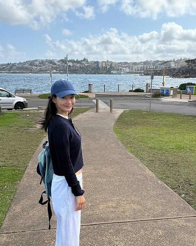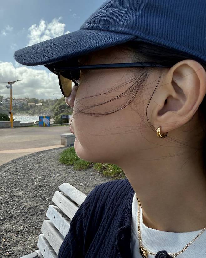 네이비 볼캡, 썬글라스, 니트 가디건,