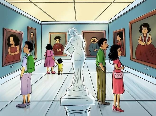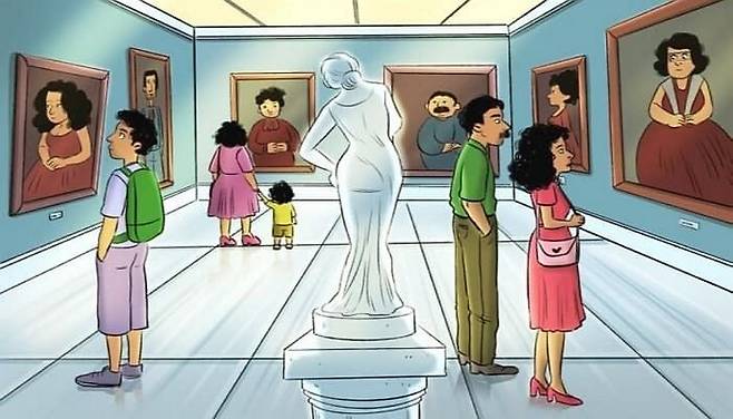 그림 속에 사림이 모두 몇 명인지 답하는 문제인데요. 여기 미술관에서 작품을 감상하고 있는 사람들이 있습니다.