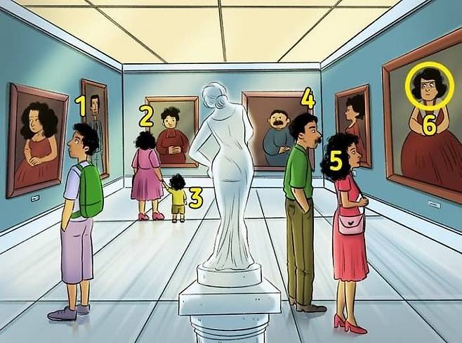 이중에서 정답 맞추신 분 계신가요. 그림 속에는 6명의 사람이 있는데 그중 한명은 오른쪽 그림 뒤에 숨어 있었습니다.