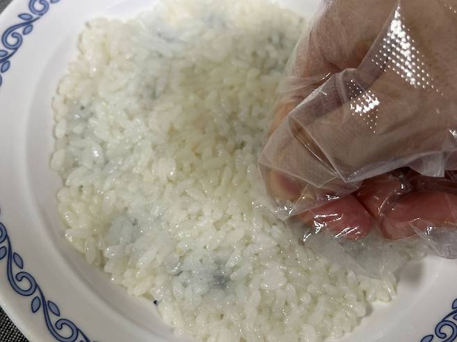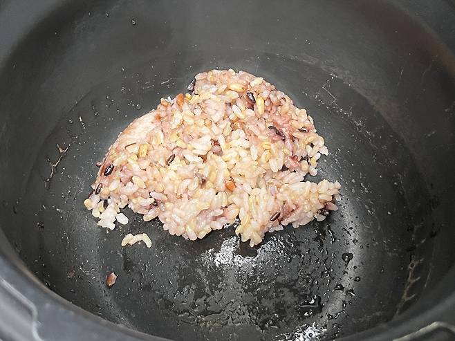 식은 밥은 쌀과 골고루 섞지 마시고, 그냥 위에 올려 두세요. 그러면 증기에 의해 촉촉하게 쪄집니다.