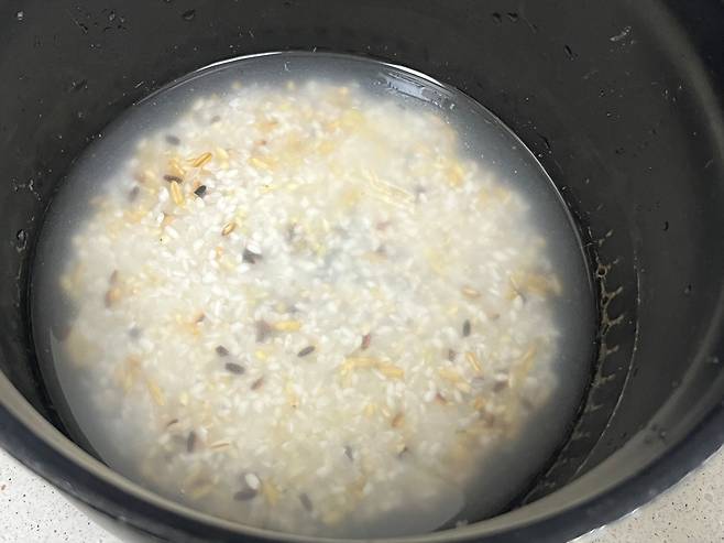 적당량의 물을 붓고 여기에 식은 밥 남은 것을 그냥 넣어 주세요. 식은 밥은 이미 수분을 머금고 있기 때문에 물을 추가로 넣지는 않습니다.