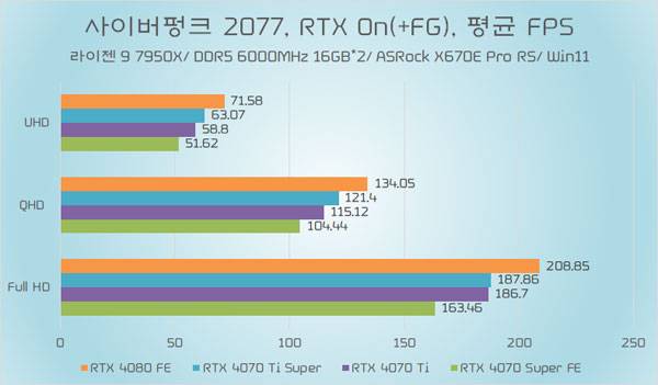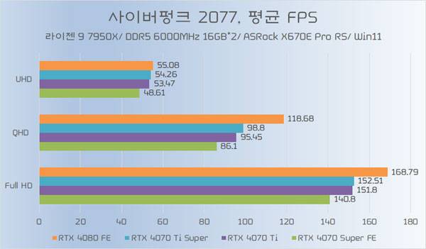 테스트에 쓰인 지포스 RTX 4070 Ti가 소폭 오버클럭된 모델임은 감안할 필요가 있지만, RTX 4070 Ti Super와의 성능 차이가 QHD 이하에서는 약 5%~6%, UHD에서는 약 8% 가량 높은 성능을 기대할 수 있다.