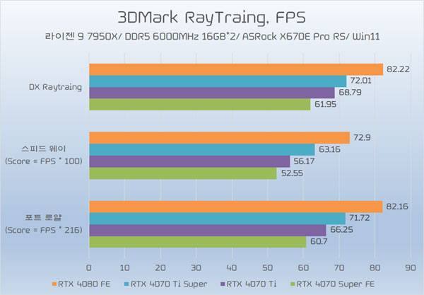 지포스 RTX 4070 Ti Super의 레이 트레이싱 성능은 지포스 RTX 4070 Ti 보다 약 8% 높은 것으로 나타나 래스터 환경보다 조금 더 나은 향상폭을 기대할 수 있고, RTX 4080 FE와 비교해서는 약 88% 수준으로 나타나, 래스터 성능과 거의 비슷한 비율이 기대된다.