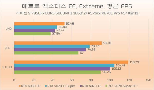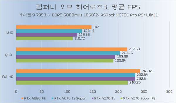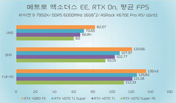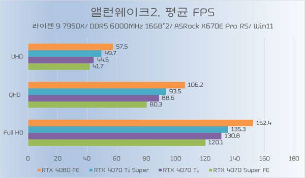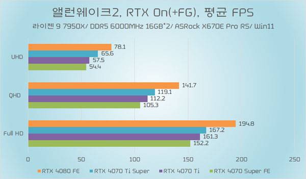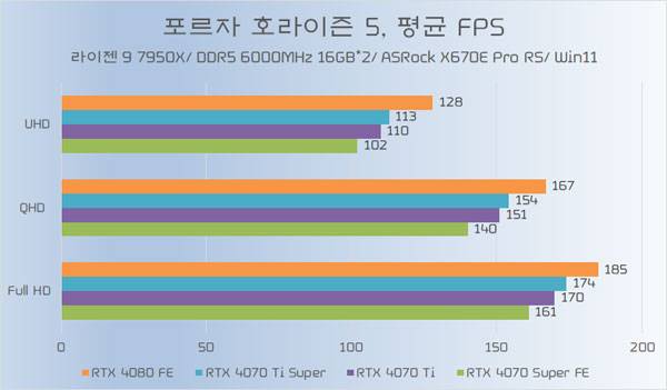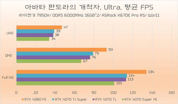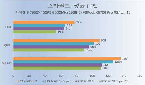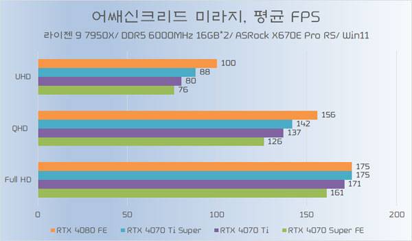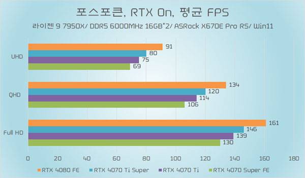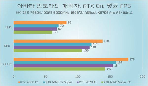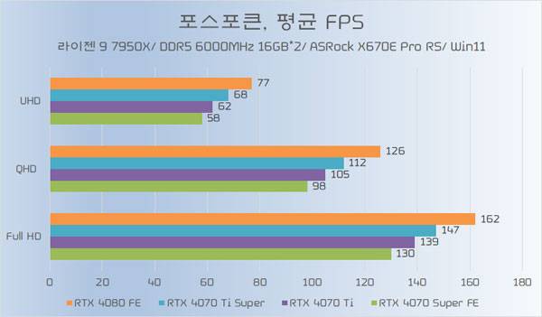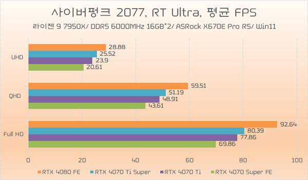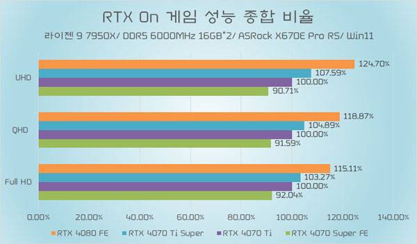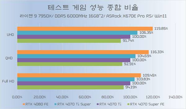 테스트에 쓰인 지포스 RTX 4070 Ti가 소폭 오버클럭된 모델임은 감안할 필요가 있지만, RTX 4070 Ti Super와의 성능 차이가 QHD 이하에서는 약 5%~6%, UHD에서는 약 8% 가량 높은 성능을 기대할 수 있다.