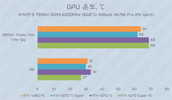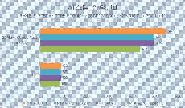 3DMark Time Spy Stress Test에서 게인워드 지포스 RTX 4070 Ti Super 피닉스의 시스템 전력은 지포스 RTX 4070 Ti와 같은 수준으로 측정된 것을 감안하면, TGP 기준 전력 스펙을 동일하게 책정했다는 엔비디아의 발표가 검증되었다고 볼 수 있다.