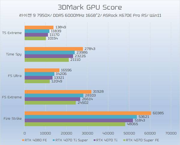GPU 스코어 기준 RTX 4070 Ti보다 약 5% 가량 높은 것으로 나타났고, RTX 4080 FE와 교했을 때는 약 88% 수준의 성능, RTX 4080 FE이 RTX 4070 Ti Super보다 약 16% 가량 높은 성능을 내주는 것으로 나타났다.