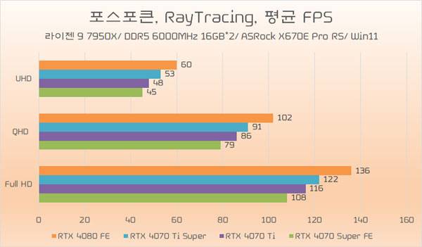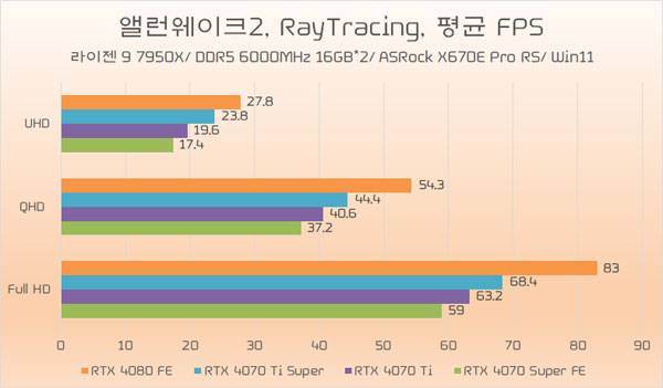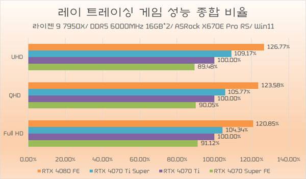 지포스 RTX 4070 Ti Super의 레이 트레이싱 성능은 지포스 RTX 4070 Ti 보다 약 8% 높은 것으로 나타나 래스터 환경보다 조금 더 나은 향상폭을 기대할 수 있고, RTX 4080 FE와 비교해서는 약 88% 수준으로 나타나, 래스터 성능과 거의 비슷한 비율이 기대된다.