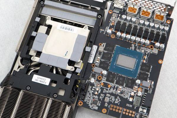 게인워드 지포스 RTX 4070 Ti Super 피닉스의 쿨러를 분리하면 PCB와 쿨링 솔루션의 구조를 확인할 수 있다. GPU와 VRAM, 전원부를 구성하는 DrMOS, 초크의 발열을 모두 커버하는 구조며, 메인 쿨링 솔루션과 PCB 사이에 추가로 제품 변형 방지를 위한 프레임을 더했다.