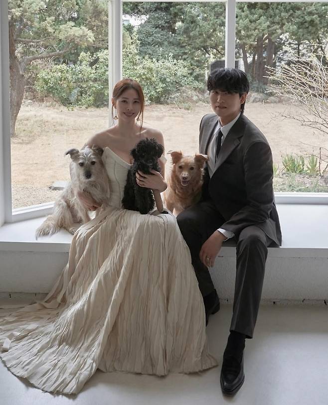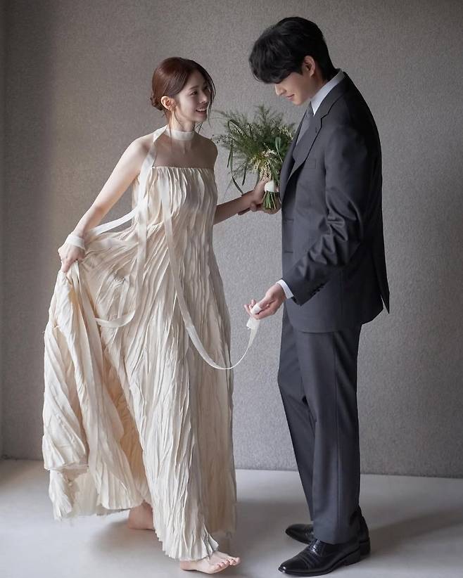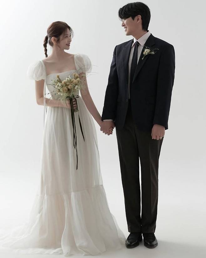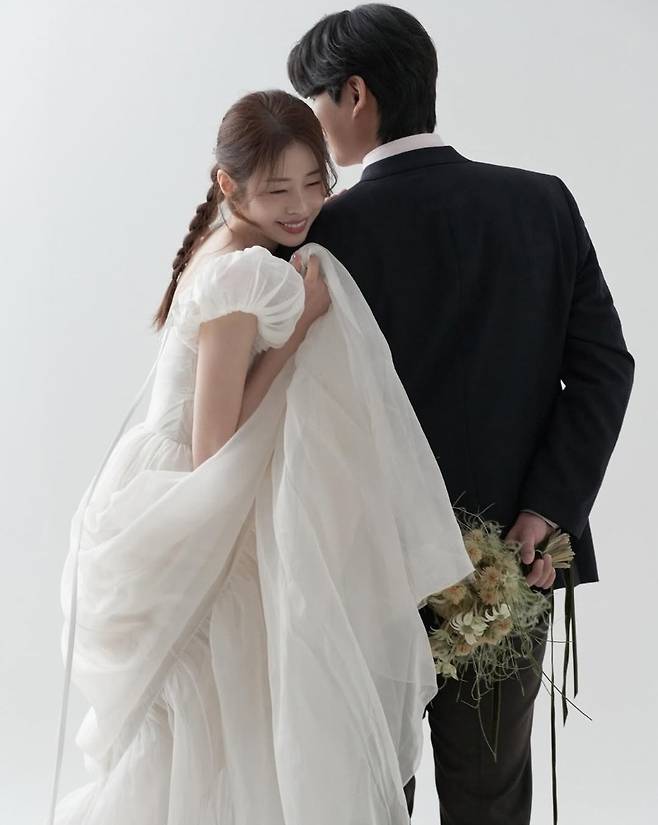 특히 블랙 슈트를 입은 신랑과 함께한 투샷에서는 은은한 케미가 돋보이며 화보의 몰입도를 높였습니다.