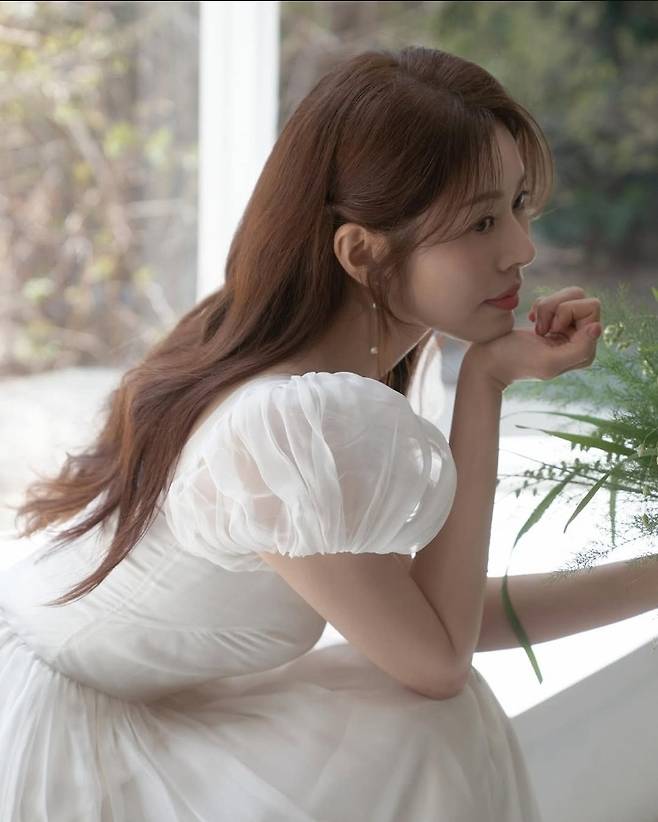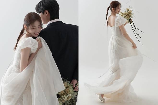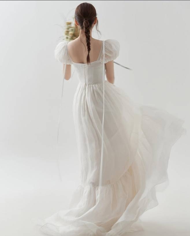 살랑이는 쉬폰 드레스는 우아한 곡선을 따라 흘렀고, 부케와 함께한 촬영에서는 순수하면서도 기품 있는 분위기가 극대화됐습니다.