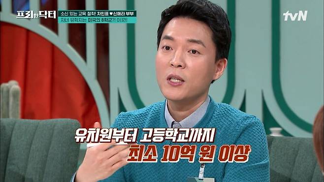 실제로 차인표 신애라 부부는 자녀들을 '미국의 강남 8학군'으로 불리는 미국 어바인으로 아이들 학교를 보냈으며 유치원부터 고등학교까지 모두 수료할 경우 수업료가 약 10억이 넘는 금액이 든다고 합니다.