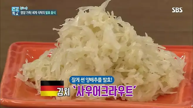 사우어크라우트는 양배추를 소금에 절이고 발효해 만든 독일의 대표 발효 식품이다. 사우어크라우트에 함유된 칼륨이 체내 염분을 배출하여 고혈압, 혈관질환에 도움을 준다고 한다. 또한 식이섬유, 비타민C, 클로로필, 베타카로틴 등의 성분이 풍부하여 암세포의 증식을 억제하고 체내 독성을 제거해 몸의 해독 기능을 높여준다고. 그뿐 아니라 락토바실러스, 류코노스톡 등의 유산균이 장내 유익균 함량을 높여주어 설사, 변비 예방에도 효과적이라고 한다.