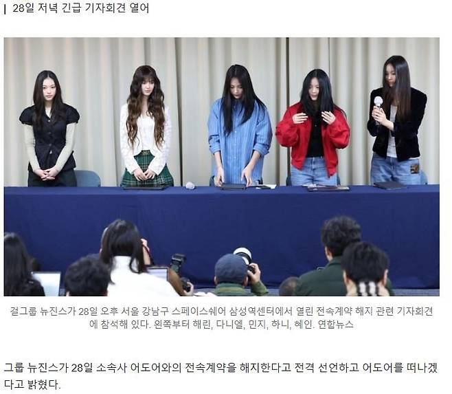 뉴진스 멤버 민지(김민지), 하니(하니 팜), 다니엘(다니엘 마쉬), 해린(강해린), 혜인(이혜인)은 이날 저녁 8시30분 서울 강남구 삼성동의 한 복합문화공간에서 기자회견을 열고 “(어도어에) 전속계약 위반의 시정을 요구했고 오늘 자정이 되면 끝이 나는데, 개선의 의지가 없는 보여주기식 메일만 보냈을 뿐 시정은 이뤄지지 않았다”며 “(어도어의) 무성의한 태도가 너무 지치고 우리에 대한 진심이 없구나 다시 한번 느꼈다. 어떠한 시정도 이뤄지지 않아서 29일 자정(0시) 전속계약을 해지한다”고 밝혔다.
