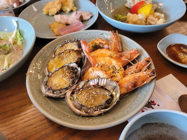 옆동네 완도산 전복과 새우치즈구이. 나열했던 음식들 중 가장 비씨고 맛있었던 메인 메뉴가 아닐까 한다. 4인 사이좋게 나눠 먹으라며 인원수에 맞게 담아주는데, 그 옛날 유배온 왕족에 빙의하여 버터향 가득한 전복을 한입에 털어넣어 진한 남도의 맛을 음미하는 호사를 부려 보았다.