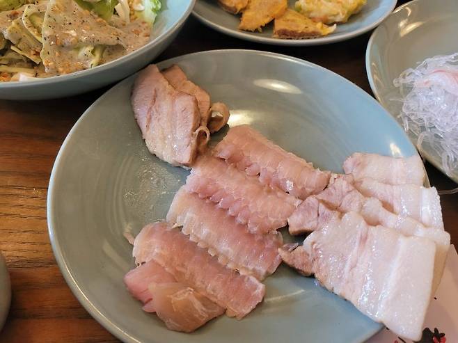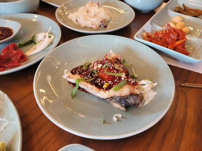 남도 한식에서 홍어가 빠지면 섭하지라 삽합으로 먹으라며 묵은지와 돼지고기 수육을 함께 곁들여 준다. 대중적인 입맛에 맞췄기에 코가 쨍하도록 삭힌 전라도 홍어는 아녔지만 신김치에 수육 올려 먹으니 막걸리를 절로 부른다.