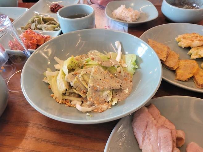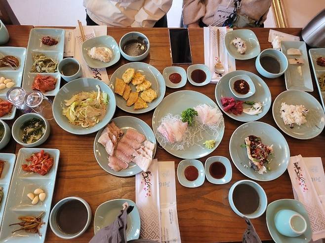 자리를 잡으니 신속하게 상이 차려진다. 이것만 해도 입이 떡 벌어진다. 모든 접시는 푸른도자기인데, 이름처럼 청자골에서 구운 청자쯤 되려나?기본상 세팅만으로도 차고도 넘치는데 이후로 줄줄이 서빙되는 음식들이 대기하고 있어서 접시를 겹쳐놓아야 할 정도이다. 이것이 바로 상다리 부러지는 남도 인심이구나