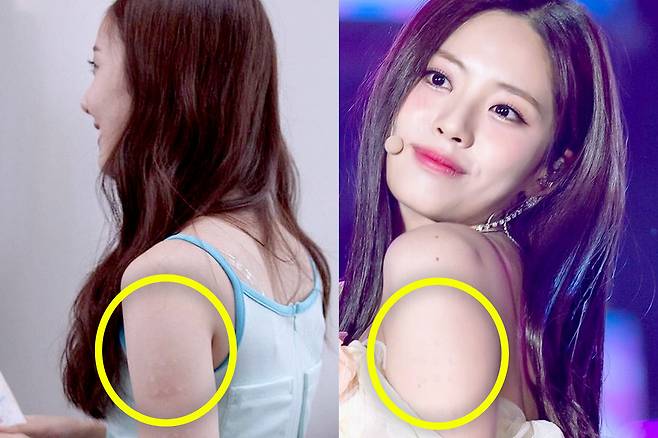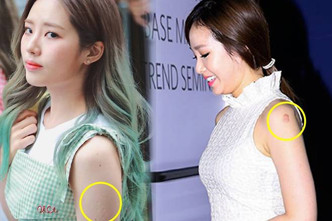 1998년생인 그룹 여자친구의 멤버 신비와 1996년생인 그룹 트와이스의 모모, 2000년생인 그룹 엔시티의 제노 또한 같은 형태의 주사 자국으로 1995년생 이후 출생자임을 알 수 있죠.