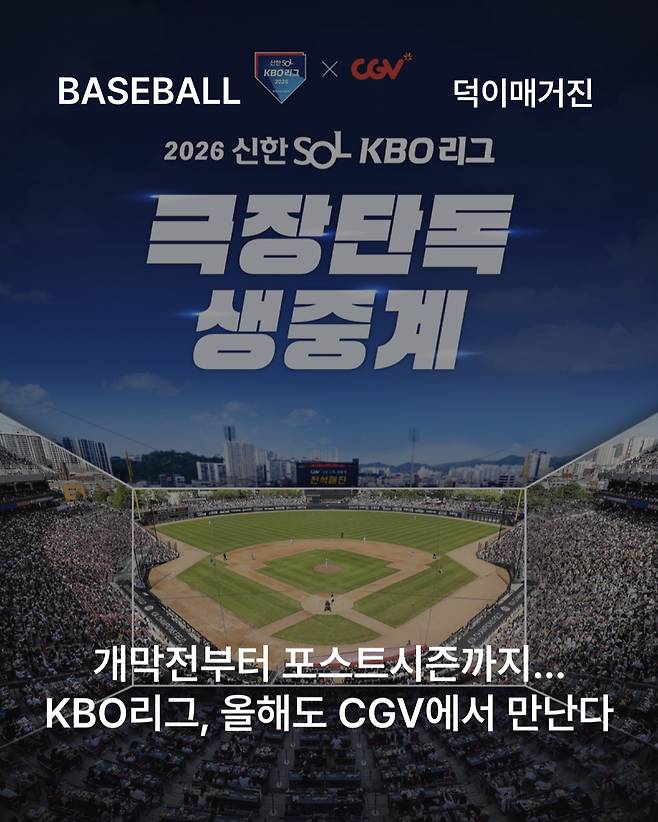 KBO가 2026 시즌에도 CJ CGV와 함께 KBO 리그 주요 경기를 극장에서 생중계합니다.