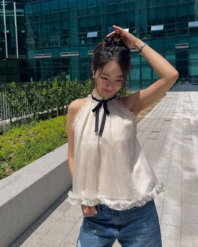 비슷한 무드를 연출하고 싶다면, 얇은 소재의 시스루 블라우스에 와이드 팬츠나 데님 쇼츠를 매치해보자. 프릴 디테일이나 리본 장식이 들어간 상의를 선택하면 스타일링에 포인트를 줄 수 있다. 헤어는 깔끔하게 묶거나 헤어핀으로 업스타일을 연출하면 얼굴선을 돋보이게 하며 전체적인 분위기가 살아난다.