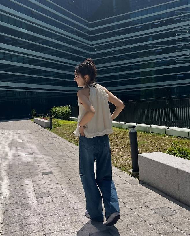 하의는 여유 있는 핏의 데님 팬츠로 밸런스를 맞췄다. 캐주얼한 무드를 주면서도 과한 느낌 없이 자연스러운 믹스매치가 가능하도록 연출했다. 손목에 더해진 심플한 실버 브레이슬릿은 전체 스타일에 은은한 포인트가 된다. 특히 그녀가 머리를 높이 묶은 업두 헤어스타일은 블라우스의 넥 디테일을 더욱 부각시켜주며 스타일링의 완성도를 높인다.