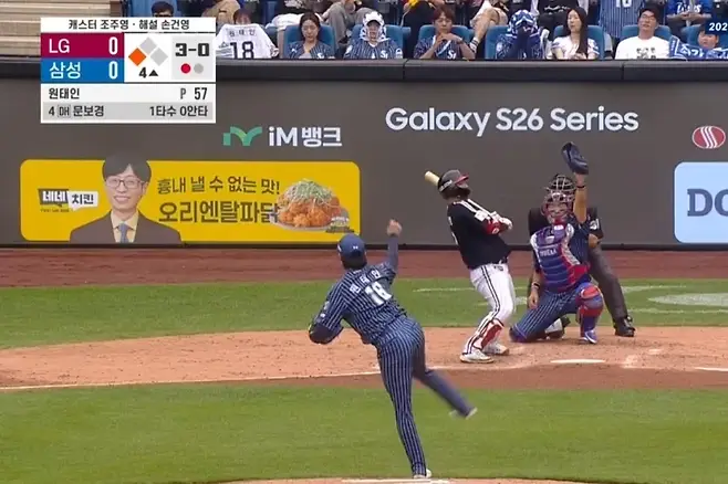 0-0으로 팽팽하던 4회초, 원태인은 문성주를 유격수 직선타로 정리한 뒤 오스틴 딘에게 우측 담장 상단을 직격하는 3루타를 허용했다. 여기서부터 급격히 흔들렸다.