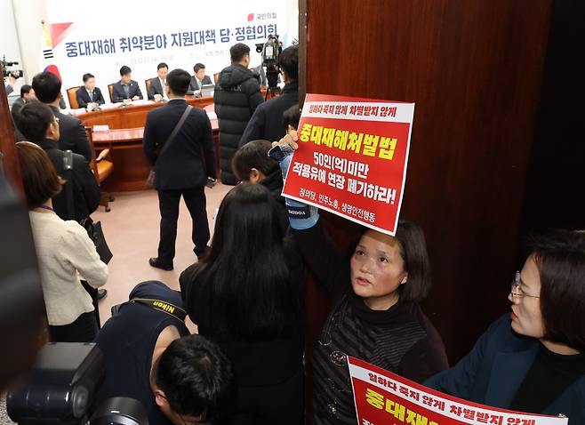 | ▲ 27일 국회에서 열린 중대재해 취약분야 지원대책 당정협의회 회의장 앞에서 고 김용균 노동자의 어머니 김미숙 씨 등이 중대재해처벌법 관련 팻말을 들고 있다. 2023.12.27 |