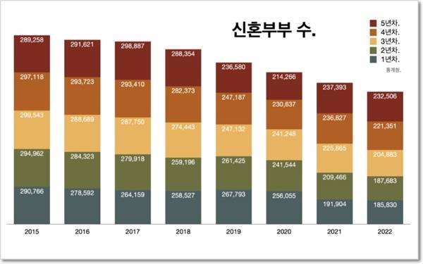 - 신혼부부 건수에서 설명이 좀 더 필요할 것 같은데요. 2015년부터 통계를 작성했는데 147만 쌍에서 2022년 103만 쌍으로 줄었습니다. 혼인 신고한 뒤 5년이 지나지 않은 부부 가운데 혼인 관계를 유지하고 국내에 거주하고 있는 부부를 집계한 것입니다.