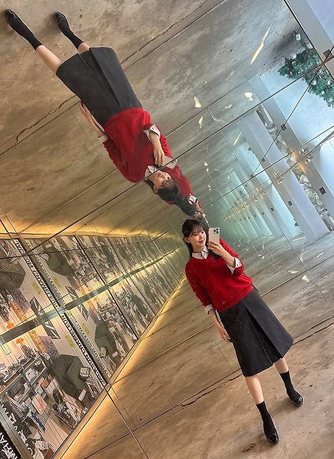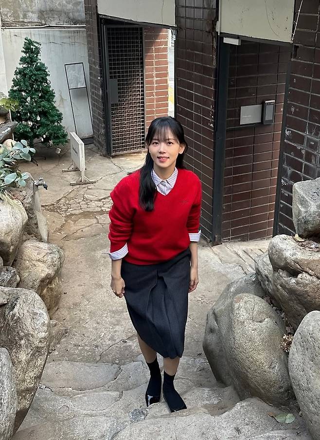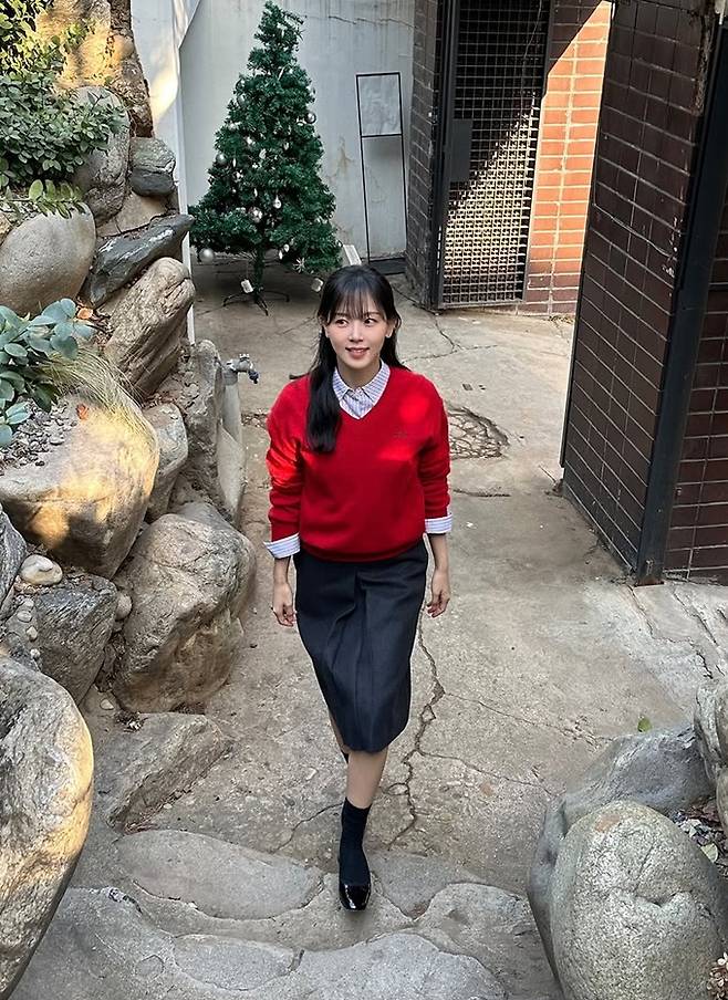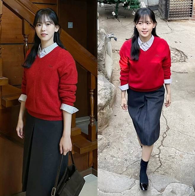 공개한 사진에서 강하나는 스트라이프 셔츠 위에 레드 니트 스웨터를 입고 그레이 스커트를 매치한 간절기룩으로 청순하면서도 강렬한 스타일을 선보였다.