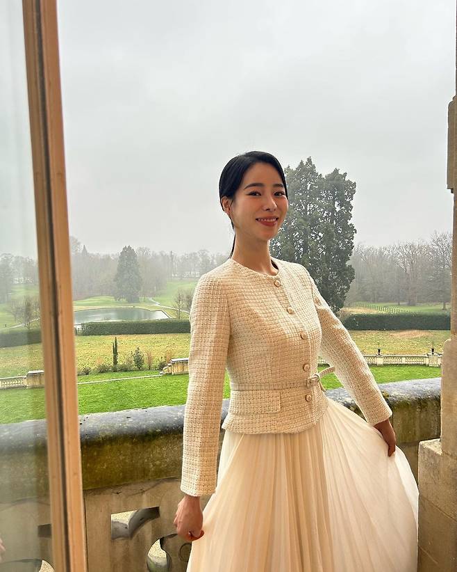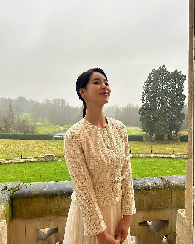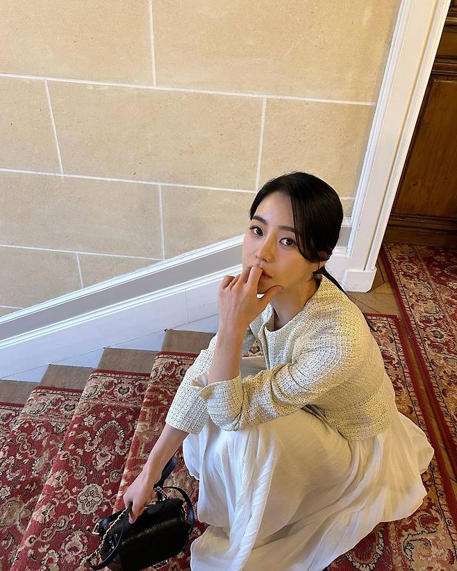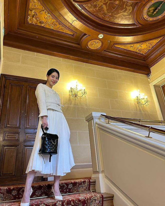 사진 속 임지연은 벨트형식의 아이보리톤 자켓과 화이트 쉬폰 스커트로 되어 있는 원피스를입고 화사하고 러블리한 모습으로 파리여행을 즐겼다.