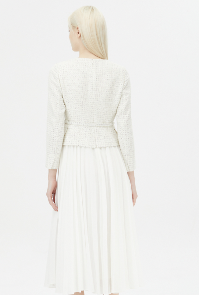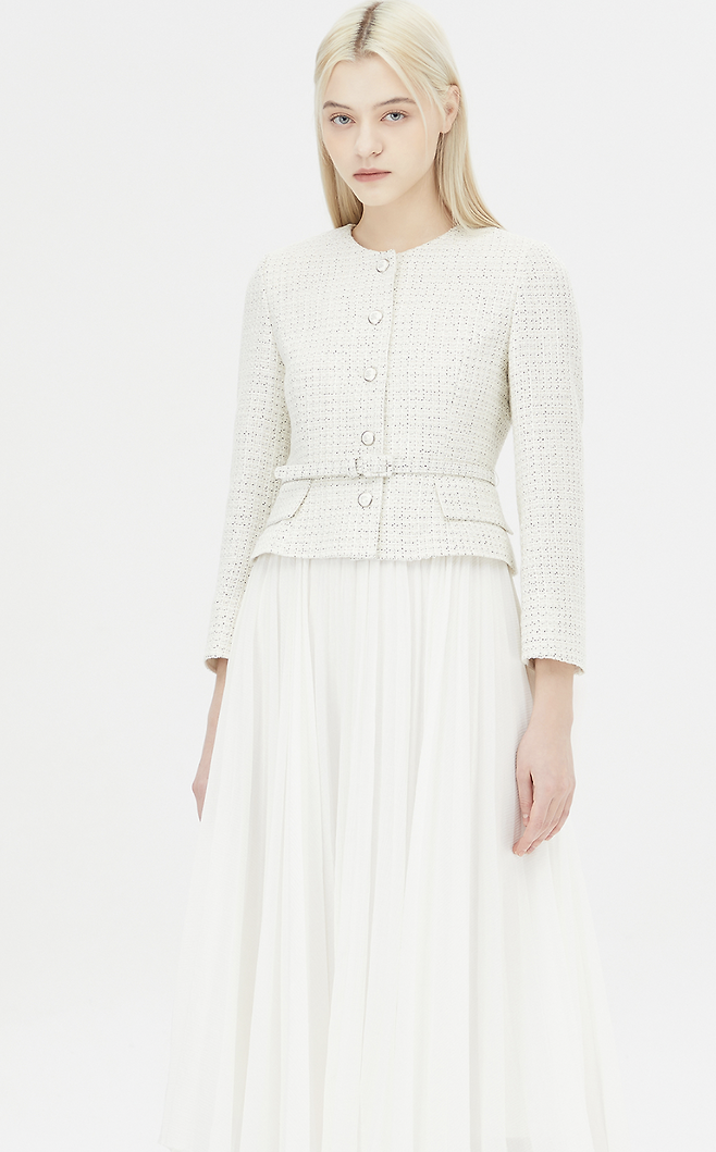라운드넥 트위드 자켓과 소프트한 무드의 스커트를 함께 코디한 듯한 하이브리드형 아이템.