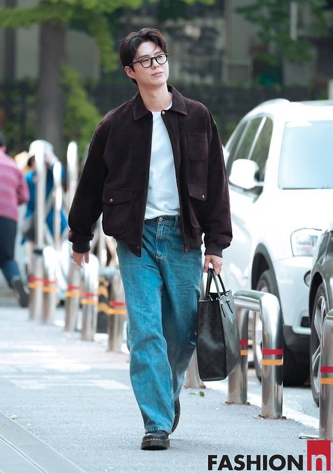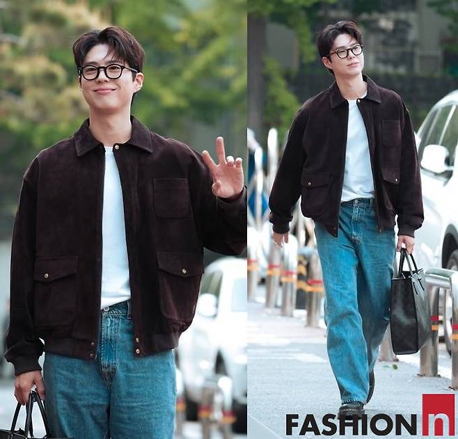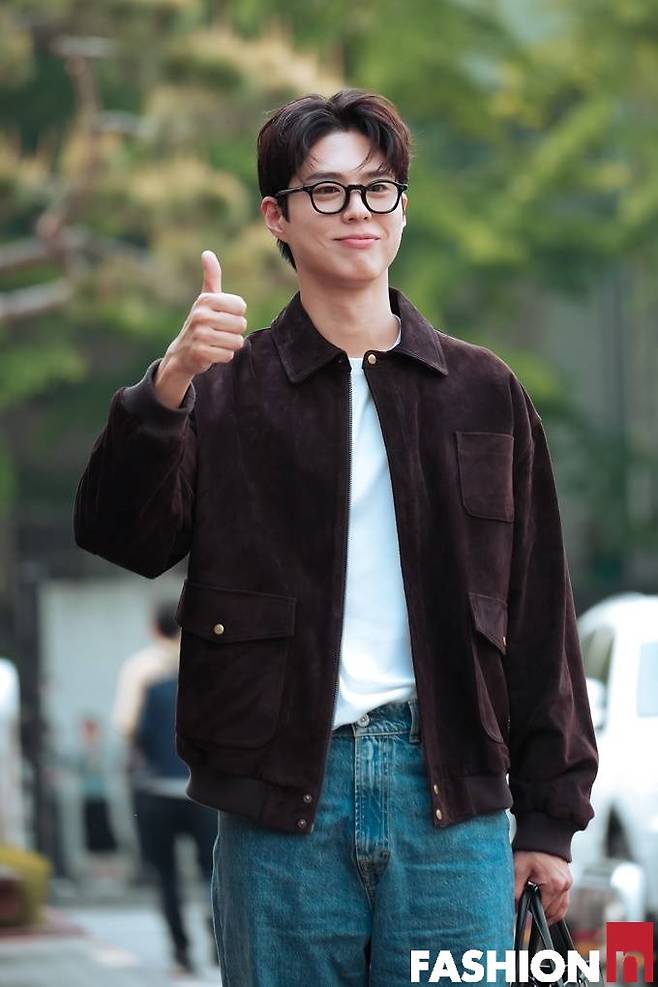 이날 박보검은 봄버 재킷과 데님 팬츠, 여기에 뿔테 안경을 쓴 댄디한 출근룩으로 멋스러운 스타일을 선보였다.