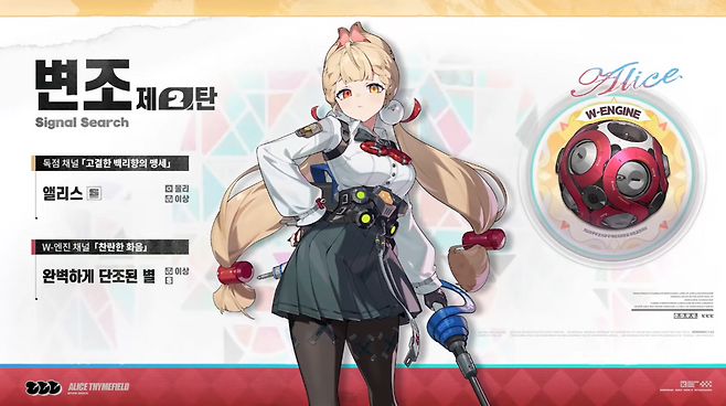 S급 물리 속성 이상 에이전트인 앨리스는 명문 귀족 가문의 후계자로 검의라는 전용 자원을 소모해 강력한 공격을 가하는 딜러다. 적에게 물리 속성 상태 이상을 부여한 후 속성 이상 피해를 기반으로 추가 딜링을 가할 수 있다. 화려한 검술로 적을 제압할 수 있다.