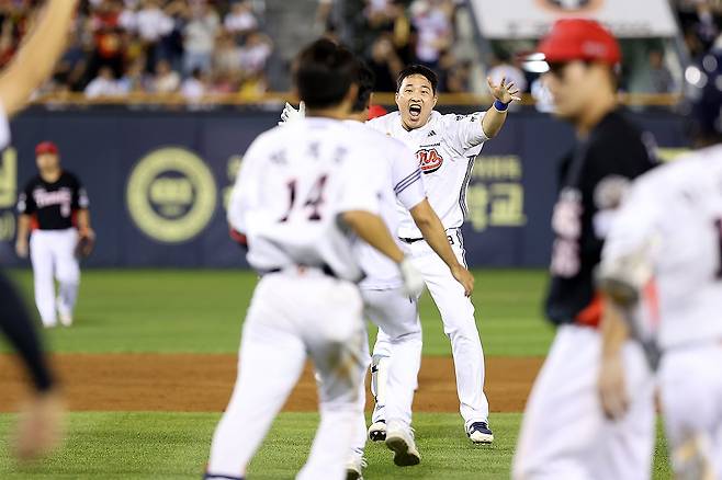(서울=연합뉴스) 두산 베어스 김인태가 16일 서울 잠실야구장에서 열린 프로야구 KIA 타이거즈와 홈 경기, 9회말 1사 만루에서 끝내기 2루타를 친 뒤 포효하고 있다. 2025.8.16 [두산 베어스 제공. 재판매 및 DB 금지]