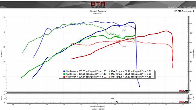 다만 4륜구동 모드로 측정했을 때는 약 3500rpm 이후부터 노킹 발생으로 인해 출력과 토크에 제한이 발생했다. 그만큼 엔진 부하가 많이 발생하는 환경이라는 것인데, 고회전 영역을 자주 이용하는 소비자라면 고급유 사용을 권장한다.