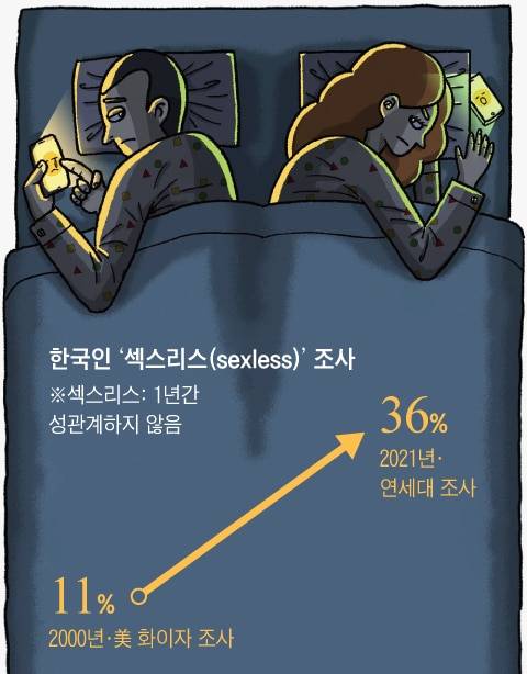 연구 결과도 이를 뒷받침합니다. 지난 2021년 연세대 염유식(사회학과) 교수와 최준용(의대 내과학교실) 교수가 발표한 ‘2021년 서울 거주자의 성생활’ 연구에 따르면, 한국 성인 3명 중 1명(36%)은 ‘지난 1년간 성관계를 갖지 않았다’고 응답했습니다. 특히 20대가 60대만큼이나 섹스를 하지 않는다는 점은 충격적이었습니다. 20대 남성은 ‘지난 1년간 성관계를 했다’는 응답(58%)이 전 연령층을 통틀어 가장 낮았고, 20대 여성도 ‘성관계를 했다’는 응답(57%)이 60대(47%)에 이어 둘째로 낮았습니다.